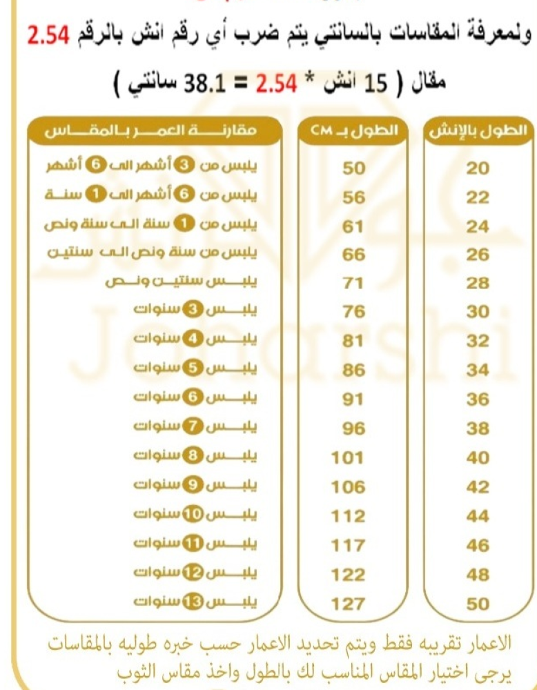 متوفر مقاسات من عمر سنه إلى 58 انش