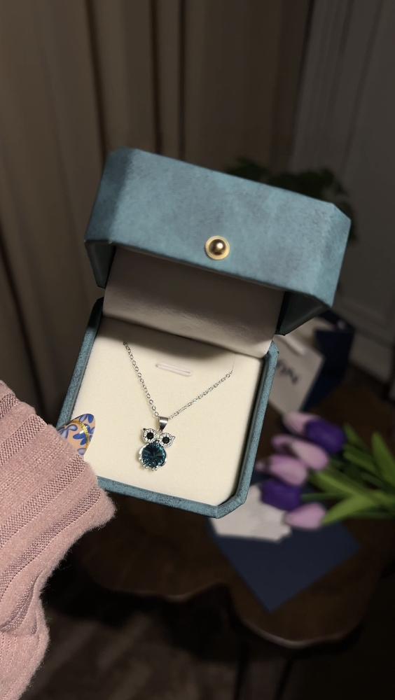 قلادة أنيقة وراقية المطلية بالفضة، تتدلّى منها حبتا زركون براقتان بتصميم بومة، تضفي لمسة أنثوية ساحرة ولمعانًا فخمًا يليق بإطلالة ملكية.